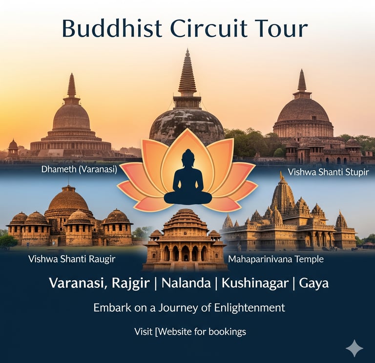 Embark on a spiritual journey following Buddha's footsteps through sacred sites where he was born (Lumbini), attained enlightenment (Bodh Gaya), delivered first sermon (Sarnath), and achieved Nirvana (Kushinagar). Visit UNESCO World Heritage Mahabodhi Temple, ancient Nalanda University, peaceful monasteries, and experience meditation sessions at these holy Buddhist pilgrimage destinations across India.